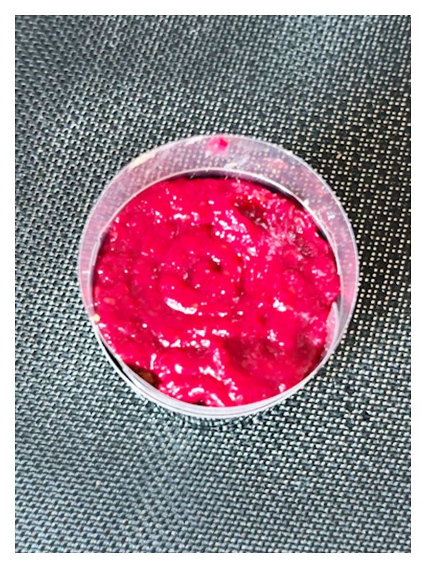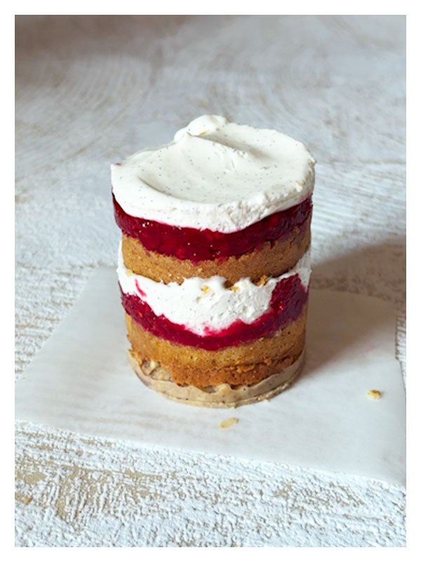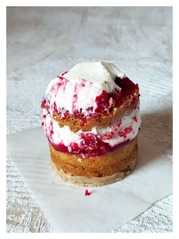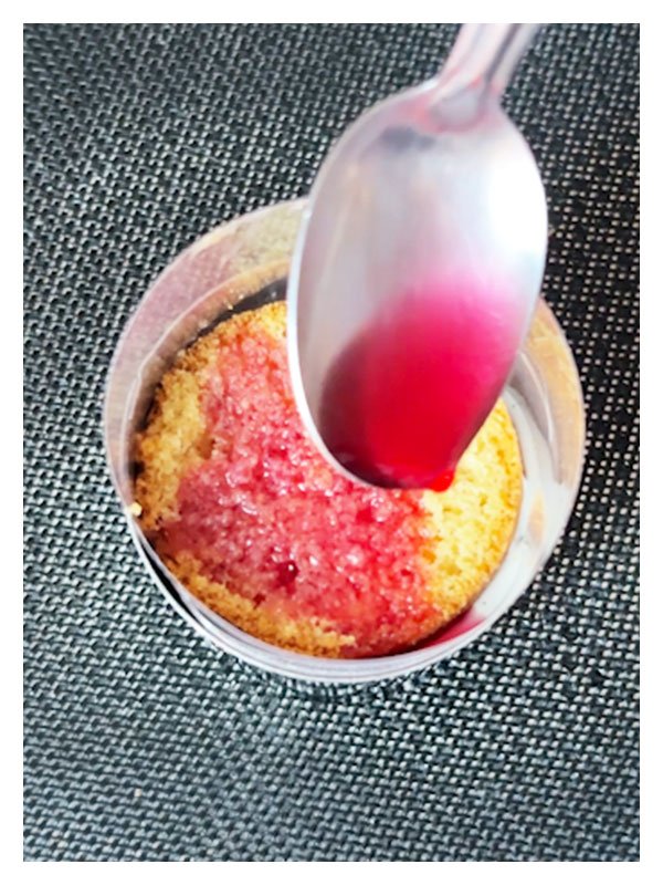 4. Par dessus, déposer un disque de molly cake et l’imbiber avec du sirop d’hibiscus.