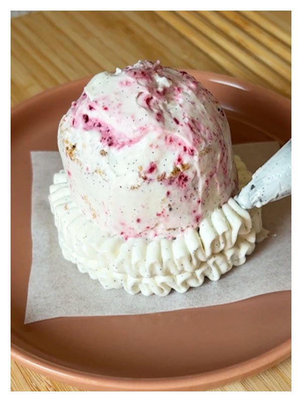 2. Recouvrir entièrement le gâteau de ganache montée vanille et lisser.