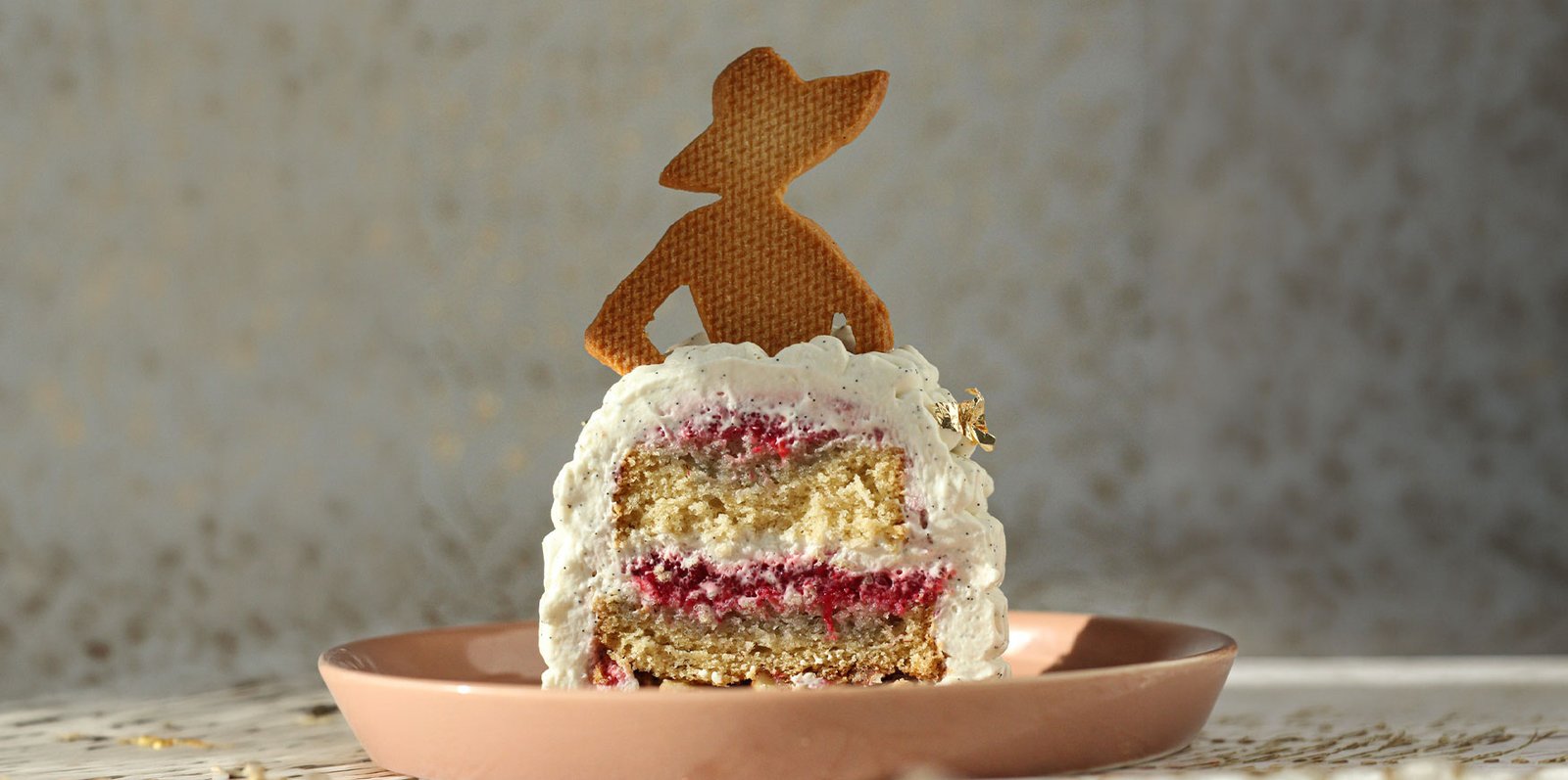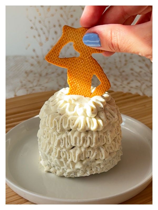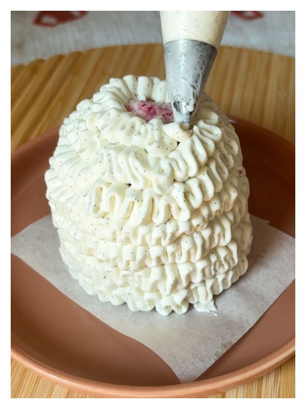 7. Répéter l’opération (molly cake, sirop d’hibiscus, ganache montée vanille) une deuxième fois.