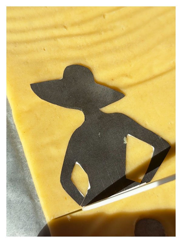 4. Découper les silhouettes des mannequins dans de la pâte sucrée. Cuire environ 12min à 160°C.