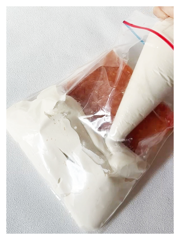 - Remplir le sac congélation de ganache au poivre de Timut à l’aide d’une poche à douille. Refermer le sac congélation et façonner le coussin selon la forme souhaitée. Réserver au congélateur 6h minimum.