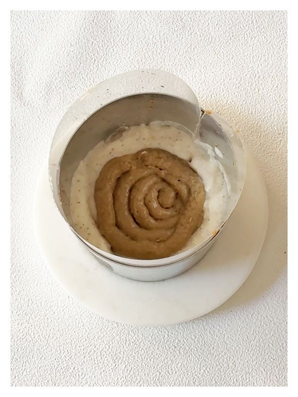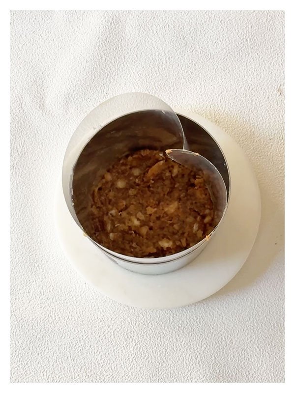 - Chemiser un cercle de 6 cm avec du rhodoïd. Déposer une fine couche de croustillant noisette.