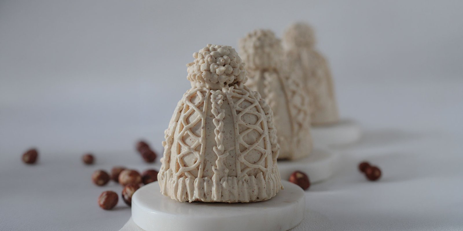- Décorer le pompon avec la ganache montée noisette et le déposer sur le haut du bonnet.